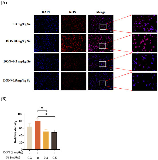 The effects of selenomethionine on the hepatic ROS level of piglets fed DON-contaminated diets is shown in Figure 3. Compared with the DON + 0 mg/kg Se group, the ROS levels in the liver of the piglets were decreased in the DON + 0.3 or 0.5 mg/kg Se groups (p < 0.05).