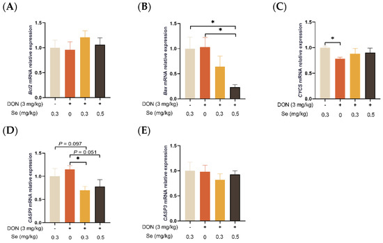 As shown in Figure 5, the hepatic relative mRNA level of CASP9 was decreased in piglets in the DON + 0.3 mg/kg Se group, in comparison to the 0.3 mg/kg Se group (p = 0.097). Nevertheless, when compared with the DON + 0 mg/kg Se group, the piglets in the DON + 0.5 mg/kg Se group had down-regulated relative mRNA levels of Bax (p < 0.05) and CASP9 in their livers (p = 0.051). Moreover, compared with the DON + 0 mg/kg Se group, piglets in the DON + 0.3 mg/kg Se group had down-regulated relative mRNA levels of CASP9 in the liver (p < 0.05).