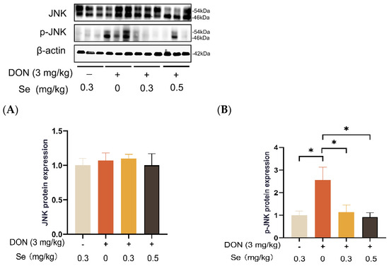 Effects of selenomethionine on hepatic relative protein expression of JNK and p-JNK of piglets fed deoxynivalenol (DON)-contaminated diets. (A) JNK protein level. (B) p-JNK protein level. Abbreviations: JNK, c-Jun N-terminal kinase; p-JNK, phosphorylated JNK. Each bar in the graph symbolizes mean ± SEM with 6 replicates. * p < 0.05.