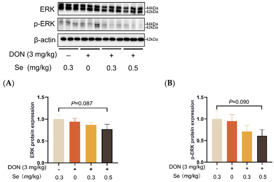 Compared to the 0.3 mg/kg Se group, the protein expression level of p-JNK was increased in the livers of the piglets in the DON + 0 mg/kg Se group (p < 0.05). However, compared with the DON + 0 mg/kg Se group, the protein expression level of p-JNK was down-regulated in the livers of piglets in both the DON + 0.3 mg/kg Se group and the DON + 0.5 mg/kg Se group (p < 0.05) (Figure 8). In addition, compared with the 0.3 mg/kg Se group, the protein expression levels of ERK (p = 0.087) and p-ERK (p = 0.090) tended to be down-regulated in the DON + 0.5 mg/kg Se group (Figure 9). However, the protein expression levels of p38 and p-p38 were not impacted by the dietary treatments (p > 0.05) (Figure 10).
