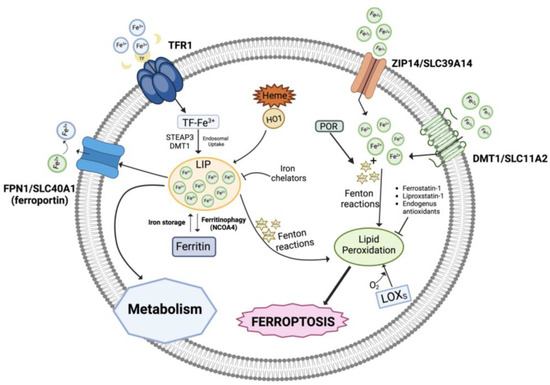 The induction of ferroptosis employes specific pathways involving redox active iron and/or iron-dependent peroxidation enzymes. Iron is a fundamental cofactor for several enzymes involved in oxidation–reduction reactions due to its ability to exist in two ionic forms: ferrous (Fe2+) and ferric (Fe3+) iron. As mentioned before, in the ferroptosis context, the enzymes that catalyze lipid peroxidation are mostly heme or non-heme iron enzymes [37,38]. Consequently, iron homeostasis plays a crucial role in lipid peroxidation.