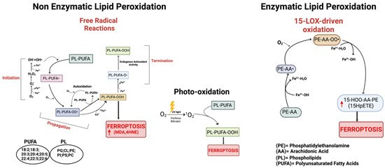 - The radical-chain process (or radical chain reaction) consists of three sequential non-enzymatic events: initiation, propagation, and termination (Figure 2). Free reactive oxygen-centered radicals, in particular HO• and HOO•, mainly originate from Fenton reactions and can initiate the lipid peroxidation process of different types of PL-PUFAs, frequently those present in biological membranes. In fact, by abstracting a hydrogen atom from a methylene carbon inside the acyl chain double bounds, HO• and HOO• leave an unpaired electron on the carbon, generating a reactive carbon-centered lipid radical (PL-PUFA•); this last can also originate in a spontaneous manner inside the acyl chain harboring the “C=C” double bond (autooxidation/autocatalytic) [130]. Usually, this lipid radical undergoes molecular rearrangement to form an internal conjugated diene, which by reacting with O2 rapidly produces a lipid peroxyl radical (PL-PUFA-OO•). These molecules can subsequently remove hydrogen atoms from adjacent PL-PUFA chains or can combine with each other in several ways (propagation event), producing lipid hydroperoxides (PL-PUFA-OOH), especially if they encounter metals like iron or copper, that by Fenton reactions can also push lipid autoxidation [131]. Thus, if not interrupted by chain-breaking antioxidants (a termination step), an internal radical propagation and peroxidation of lipid radical species can result in a large amount of lipid peroxides [132,133]. The comparatively low dissociation energy of O-O bonds causes PL-PUFA-OOH cleavage, which produces a variety of secondary oxidation products, many of which have an oxygen-containing functionality and a shortened carbon chain with strong electrophilic tendencies. The most common electrophiles are aldehydic, oxo-, and epoxy groups, which can be found at various points along the hydrocarbon chain. Either the truncated phospholipid or the remaining shorter PUFA fragment can form an electrophilic group. Furthermore, persistent exposure to iron and/or copper leads to the decomposition of lipid hydroperoxides with the production of harmful carbonyl compounds like unsaturated 4-hydroxynonenal (4-HNE), malondialdehyde (MDA), and acrolein or end products [134] that can further foster destabilization of cell membranes, finally evoking the breakdown of membrane integrity and consequently ferroptosis [135,136].