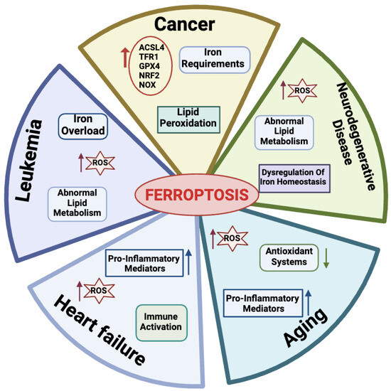 Aging is a natural life process characterized by a gradual deterioration of physiological mechanisms, resulting in impaired functions of the organs and increased morbidity and mortality due to a combination of environmental and genetic factors. Hallmarks of aging processes include overproduction of ROS species, exhaustion of antioxidant systems, imbalance in oxidation and antioxidant processes [52], and the up-regulation of oxidative stress-induced pro-inflammatory mediators [53,54]. More recently, aging has also emerged as a process related to dysregulated iron homeostasis with intracellular iron stores accumulating with increasing age [55]. Therefore, since the discovery of the ferroptotic mechanisms, a link between aging and ferroptosis has been postulated in a variety of age-related processes, including cancer, neurodegenerative, and cardiovascular diseases [56]. As an example, in this section, we briefly introduce the impact of ferroptosis on these diseases.