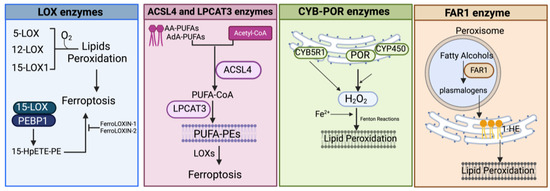 - Lipid peroxidation by direct enzymatic mechanisms principally involves members of the lipoxygenase (LOX) family coupled to ACSL4/LPCAT3 activity and the oxidoreductase NADPH-cytochrome P450 reductase (POR) isoforms as well as fatty acyl-CoA reductase1 (FAR1), as discussed in the next section.