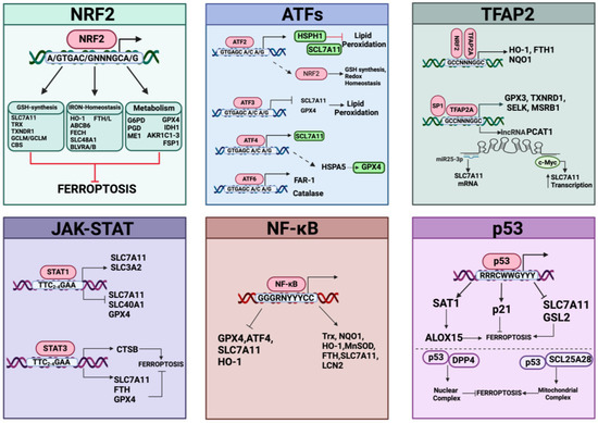 Ferroptosis is a type of programmed cell death that differs from apoptosis, autophagy, and necrosis and is related to several physio-pathological processes, including tumorigenesis, neurodegeneration, senescence, blood diseases, kidney disorders, and ischemia–reperfusion injuries. Ferroptosis is linked to iron accumulation, eliciting dysfunction of antioxidant systems, which favor the production of lipid peroxides, cell membrane damage, and ultimately, cell death. Thus, signaling pathways evoking ferroptosis are strongly associated with those protecting cells against iron excess and/or lipid-derived ROS. Here, we discuss the interaction between the metabolic pathways of ferroptosis and antioxidant systems, with a particular focus on transcription factors implicated in the regulation of ferroptosis, either as triggers of lipid peroxidation or as ferroptosis antioxidant defense pathways.