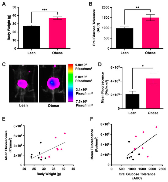 ROS-associated NIRF signaling strongly correlates with metabolic status as determined with oral glucose tolerance. (A) Mice fed a high-fat diet demonstrated greater body weight than mice fed a low-fat diet, allowing mice to be differentiated based on the lean vs. obese phenotype. Data were analyzed using an unpaired t-test and are reported as mean ± SD; n = 7 mice per group, *** p ≤ 0.001. (B) Oral glucose tolerance, calculated as area under the curve (AUC) over the course of 3 h. Data were analyzed using an unpaired t-test and are reported as mean ± SD; n = 7 mice per group, ** p ≤ 0.01. (C) Representative overlay NIRF and corresponding brightfield images of lean and obese mice. The NIRF intensity scale, shown at right, was normalized using Bruker Molecular Imaging Software. (D) ROS-associated NIRF in lean and obese mice. Data were analyzed using an unpaired t-test and are reported as mean ± SD; n = 7 mice per group, * p ≤ 0.05. (E) Pearson correlation of NIRF signaling with body weight. Black points denote lean mice while pink points denote obese mice; n = 14 mice, r = 0.6405, p = 0.00136. (F) Pearson correlation of NIRF signaling with oral glucose tolerance. Black points denote lean mice while pink points denote obese mice; n = 14 mice, r = 0.5712, p = 0.0329.