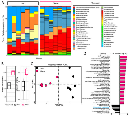 16S rRNA gene diversity metrics and membership differ significantly based on mouse phenotype. (A) Taxa bar plots highlight taxonomic differences between genotypes, summed at the family level, according to relative abundance. Obese (n = 7) and lean (n = 7) mice showed different microbial community profiles at the family level. (B) Boxplots show two alpha diversity metrics: Pielou’s evenness (left) and Shannon’s diversity index (right) for each phenotype. Box center displays the median, the end of the box shows the upper and lower quartiles, and whiskers show the minimum and maximum values. Color corresponds to genotype. (C) Principal coordinate analysis of the weighted unifrac distance metric shows differences in microbial community structure between phenotypes. Principal coordinate (PC) 1 accounts for 47% of variation observed, while PC2 accounts for 19% of variation. (D) Linear discriminant effect size (LEfSe) analysis found that 41 ASVs were discriminant in either phenotype (p < 0.05). Taxonomy is listed by genus, unless a higher taxonomy level was assigned. Size of bar represents linear discriminant analysis (LDA) score and direction, and color indicates which phenotype the ASV was discriminant in.