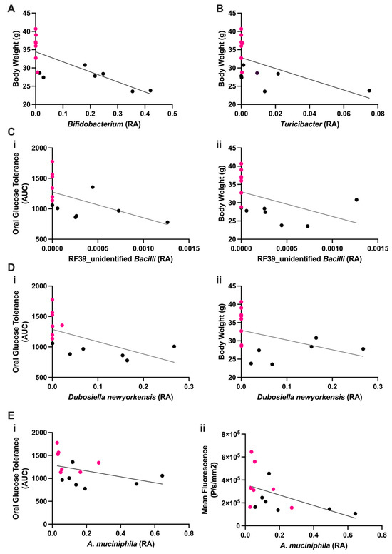 Discriminant taxa are negatively associated with body weight and oral glucose tolerance and ROS-associated NIRF. (A) Bifidobacterium is negatively associated with body weight; r = −0.8857, p < 0.0001. (B) Turibacter is negatively associated with body weight; r = −0.6565, p = 0.0133. (C) An unidentified Bacilli was found negatively correlated with (i) oral glucose tolerance (r = −0.662, p = 0.0122) and (ii) body weight (r = −0.7326, p = 0.0042). (D) Dubosiella newyorkensis is negatively correlated with (i) oral glucose tolerance (r = −0.7549, p = 0.0029) and (ii) body weight (r = −0.7732, p = 0.002). (E) A. muciniphila is negatively correlated with (i) oral glucose tolerance (r = −0.6088, p = 0.0236) and (ii) ROS-associated NIRF (r = −0.6308, p = 0.0181). All relationships were tested using Spearman’s correlation with n = 14 mice. Black points denote lean mice, while pink points denote obese mice; RA = relative abundance.