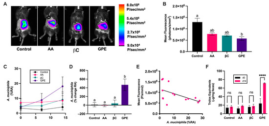 Dietary antioxidants differentially affect GI ROS and A. muciniphila growth. (A) ROS-associated NIRF signaling of lean mice after 14 days of treatment with dietary antioxidants demonstrates that GPE significantly reduces GI ROS. The NIRF intensity scale, shown at right, was normalized using Bruker Molecular Imaging Software. Data were analyzed using one-way ANOVA with Tukey’s multiple comparisons test and are reported as mean ± SD; n = 5 mice per group; Control vs. AA, p = 0.0582; Control vs. βC, p = 0.0584; Control vs. GPE, p = 0.0117. Values not sharing common letters are significantly different from one another (p ≤ 0.05). (B) Representative overlay NIRF and corresponding brightfield images of lean mice treated with dietary antioxidants for 14 days. (C) Change in relative abundance of A. muciniphila over the course of 14 days of treatment with dietary antioxidants. No significant differences in raw values were observed across time or between treatments. Data were analyzed using two-way ANOVA with Tukey’s multiple comparisons test and are reported as mean ± SD. Values not sharing common letters are significantly different from one another (p ≤ 0.05). (D) Relative changes in A. muciniphila relative abundance demonstrates that GPE stimulates bloom in comparison to the control, while the other dietary antioxidants do not. Data were analyzed using one-way ANOVA with Tukey’s multiple comparisons test and are reported as mean ± SD; n = 5 mice per group. Values not sharing common letters are significantly different from one another (p ≤ 0.05). (E) NIRF signaling is inversely correlated with A. muciniphila relative abundance after 14 days of treatment with dietary antioxidants; Spearman r = −0.6264, p = 0.0191. (F) Antioxidant activity (Trolox equivalents) in fecal samples before (d0) and after (d14) daily exposure to dietary antioxidants. Data were analyzed using two-way ANOVA with Tukey’s multiple comparisons test and are reported as mean ± SD; n = 5 mice per group, **** p ≤ 0.0001, ns = not significant. AA = ascorbic acid; βC = β-carotene; GPE = grape polyphenol extract.