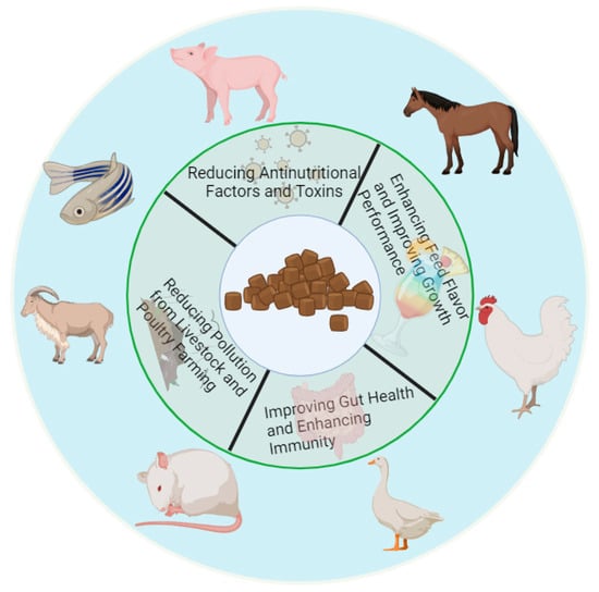 Unconventional fermented feed uses a variety of effective measures to reduce anti-nutritional factors and toxins. Through microbial action [64], enzyme action [65], and acid base treatment, the microflora and enzymes in the fermentation process can decompose, transform, and reduce the contents of anti-nutritional factors and toxins. At the same time, proper heat treatment [66] and the screening of raw materials can further reduce the presence of these harmful substances. The process of microbial fermentation can effectively decompose anti-nutritional factors and toxins in feed [67], thereby reducing their content, and has the advantages of high treatment efficiency, no reagent residue, safe use, and less nutrient loss, so fermented feed has been widely used in actual livestock and poultry production. Fermentation improves not only the nutritional value, but also the safety of feed, making it more suitable for the digestion and absorption of livestock and poultry. Yeast cell walls can adsorb mycotoxins such as aflatoxin B1, reduce the absorption of mycotoxins by the digestive tract, and protect animals from the toxic effects of mycotoxins [68]. Liu et al. [69] found that microbial fermented feed could further improve the growth performance and immune indexes of offspring mice. Wang et al. [70] showed that fermented kelp residue can promote the growth of sea cucumbers, enhance the antioxidant capacity, and maintain the stability of intestinal flora.