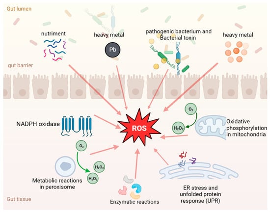 Development of ROS in the gastrointestinal tract. The orange arrows indicate that ROS can be caused by a variety of factors, such as intestinal nutrient stimulation, antigens, pathogenic bacteria, mycotoxin contamination, and heavy metal pollution, as well as autometabolism by-products such as peroxidase and oxidative phosphorylation.