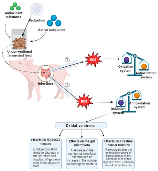 Unsaturated fatty acids in membranes of the digestive tract epithelium are prone to react with free radicals. Beneficial gut bacteria have a reduced ability to produce metabolites such as antioxidant enzymes or SCFA. The changes of free radicals in the chemical structure of tight junctions in epithelial cells of the digestive tract lead to the loss of barrier function. Arrow ① indicates that feeding animals with unconventional fermented feed can affect the development of ROS, inhibiting the impact of ROS on the oxidative–antioxidative balance system. Arrow ② indicates that animals not fed with unconventional fermented feed are unable to inhibit ROS, thus disrupting the oxidative–antioxidative balance. When the oxidative–antioxidative balance is disrupted, animals experience oxidative stress, which adversely affects digestive tissues, intestinal microbiota, and intestinal barrier function.