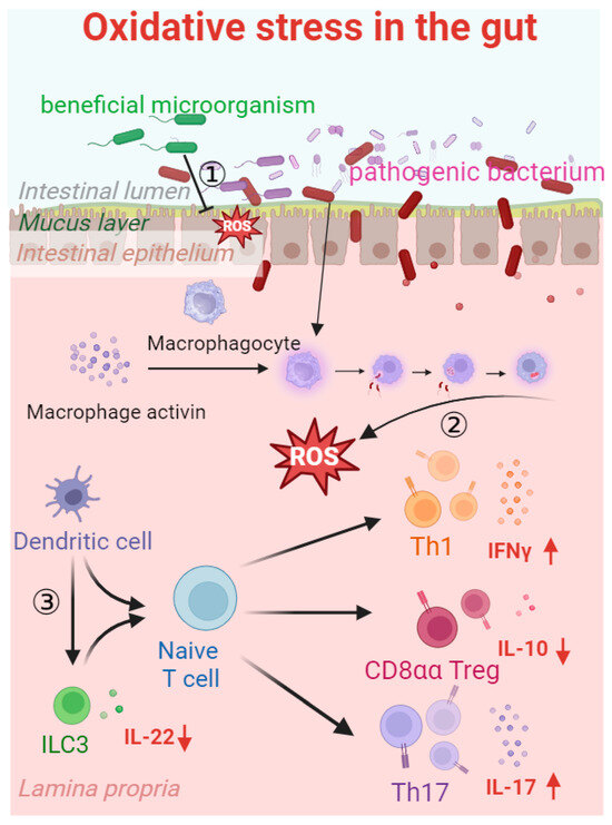 Oxidative stress in the gut. Pathogenic bacteria enter the internal environment by damaging the gaps between intestinal epithelial cells, triggering an inflammatory response. Inflammatory factors activate macrophages to produce ROS during phagocytosis, which strengthens the inhibition of beneficial bacterial colonization and biological functions. In the case of impaired barrier function, group 3 innate lymphoid cells (ILC3 cells), CD8aa cells, Th17 cells, and Th1 cells are stimulated, thereby reducing the secretion of interleukin-22 (IL-22) (↓) and interleukin-10 (IL-10) (↓) and increasing the secretion of interferon-γ (IFNγ) (↑) and interleukin-17 (IL-17) (↑). Inhibition line ① indicates the definite vegetation inhibition of beneficial microorganisms in the intestine. Arrow ② indicates that ROS are produced when harmful bacteria invade and macrophages initiate phagocytosis. Arrow ③ indicates that dendritic cells are influenced by oxidative stress, leading to the stimulation of ILC3 cells, CD8aa cells, Th17 cells, and Th1 cells, resulting in the decreased secretion of IL-22 and IL-10 and the increased secretion of IFNγ and IL-17.