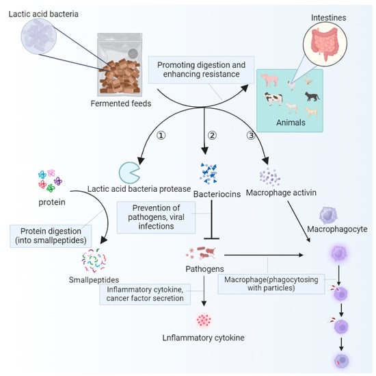 Immunomodulatory effects can promote the production and activation of immune cells, enhance the body’s immune response, and reduce the risk of animal disease [132]. Secondly, the anti-inflammatory components in fermented feed can inhibit the occurrence of inflammatory reactions, reduce the burden on the immune system, and protect the body’s tissues from damage. In addition, fermented feed can also promote the development and function of immune organs, as well as enhance the overall function of the immune system. Most importantly, it is rich in antioxidants, which can scavenge free radicals, reduce oxidative stress damage to the immune system, and improve the stability and activity of the immune system [106]. The use of unconventional fermented feed not only increases the contents of immunoactive substances such as cytokines, antibodies, and lysozymes, but also improves the immune capacity of animals by stimulating the development of immune organs, improving immune function, and increasing the weight of immune organs [155], as well as ameliorating the damage of oxidative stress to the intestine [86,87,88]. There are many different microbes in the gut that are involved in different immune defense mechanisms and influence the body’s immune response. Under intestinal oxidative stress, the contents of immunoglobulin A, immunoglobulin G, and immunoglobulin M in the intestine decrease, the number of T cells decreases, and cellular immunity is abnormal. The use of unconventional fermented feed can effectively alleviate the occurrence of this situation. The SCFAs produced during the fermentation of unconventional feed are involved in the regulation of the intestinal mechanical barrier of livestock and poultry, improving the activity of immune substances [156] and reducing the content of harmful bacteria. Studies have shown that the number and activity of immune cells are significantly enhanced when animals ingest microbial fermented feed [157,158]. According to Taranu et al. [159], feeding fermented cassava residue can increase the serum immunoglobulin content in pigs, improving humoral immune activity, and thus enhancing disease resistance. Wu et al. [128] found that the addition of FSBM to broiler diets significantly increased the weight of the bursa and thymus and reduced serum alanine aminotransferase levels. The addition of fermented full-price feed significantly increased the serum levels of interleukin-1β, IL-6, and TNF-a in laying hens [160]. Feeding fermented full-price feed significantly increased the content of insulin-like growth factor-1 (IGF-1) in the sera of finishing pigs [161], promoted the expression of the IGF-1 protein in the liver, and improved growth performance [162]. Cheng et al. [163] showed that fermented feed inhibited the growth of harmful microflora such as E. coli and enterococci, while increasing the number of beneficial microflora such as Bifidobacteria, Lactobacillus, and Ackermansi. As shown in Figure 5, lactic acid bacteria decompose the proteins in feed through the lactic acid bacteria proteases secreted by themselves, so the proteins are converted into small molecule peptides and amino acids and the digestion and absorption of feed by livestock and poultry are improved. The bacteriocins secreted by lactic acid bacteria have the miraculous effect of inhibiting the growth of pathogenic microorganisms present in the intestines after entering the intestines of livestock and poultry. With the colonization of lactic acid bacteria in the intestine, macrophages can be activated to a certain extent, promoting the immune response of immune cells in the intestine, and improving the resistance of livestock and poultry to diseases [4]. Azad et al. [46] showed that when soybean meal was partially replaced with 5% fermented cassava residue, piglets could increase their CAT, GSH-Px, and HSOD levels, as well as enhance their antioxidant capacity.