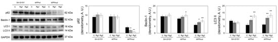 Expression of autophagy-related proteins in control and transfected SH-SY5Y cells upon 24 h treatment with Rg1 and Rg2. Representative immunoblots and densitometric analyses obtained from five independent experiments are shown (A.U., arbitrary units). GADPH staining was used to check for equal protein loading. Asterisks indicate data points statistically significant compared to the respective DMSO-treated cells (* p < 0.05, ** p < 0.01).