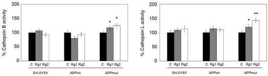 Cathepsin B and L activities detected in control and transfected SH-SY5Y cells after 24 h treatment with 50 µM Rg1 and Rg2. Activity assays were performed using fluorogenic peptides as substrates as described in the Section 2. Data are indicated as percentages versus DMSO-treated control/transfected cells (* p < 0.05, ** p < 0.01).