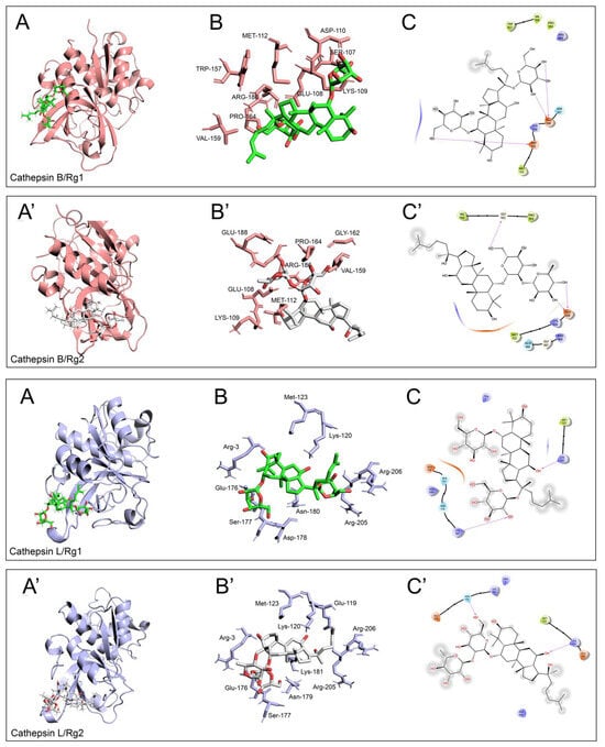 Visualization of computed binding modes of Rg1 and Rg2 to human cathepsin B (upper panels, the enzyme is indicated in pink, pdb ID: 1csb) and cathepsin L (lower panels, the enzyme is indicated in light blue, pdb ID: 3HHA). Best-scoring models of the complexes obtained upon docking onto human cathepsin B and L of ginsenoside Rg1 and Rg2 (panels (A) and (A′), respectively). Detailed 3D visualizations of amino acids constituting the allosteric site of cathepsin B and L and directly involved in the binding are reported in panels (B,B′); 2D visualization of the residues directly involved in the formation of H-bonds (purple arrows), polar (light blue ribbon), and directly involved in the formation of H-bonds (purple arrows), polar (light blue ribbon), and VdW interactions (green ribbon) are shown in panels (C,C′). Grey circles indicate atoms/groups exposed to solvent.