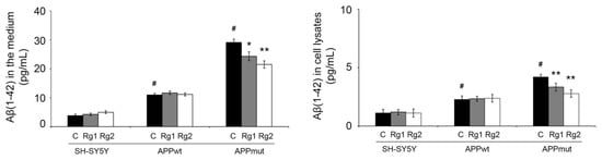 The levels of the peptide Aβ(1-42) were determined in the medium and in cellular extracts of control and APPwt/APPmut-transfected SH-SY5Y cells treated with Rg1 and Rg2. It was previously demonstrated that APPmut cells produced and released higher amounts of Aβ(1-42) peptide than APPwt cells [,]. Here, we prove that ginsenosides, particularly Rg2, significantly reduced the levels of Aβ(1-42) both in the medium and in cell extracts (Figure 5). No change in the levels of the peptide were observed in non-transfected and APPwt cells.