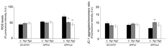 Next, we investigated the effect of ginsenosides on intracellular ROS accumulation and mitochondrial membrane potential (MMP), which are well-known mediators of oxidative stress. ROS levels were detected with the fluorescent compound DCF. Data shown in Figure 5 indicate that in the absence of treatments, APPmut cells release higher amounts of ROS compared to control SH-SY5Y cells, confirming the high levels of oxidative stress previously described for this clone []. ROS levels in APPmut cells were decreased by approximately 20% by treatment with Rg1/Rg2 (Figure 6, left panel). As for untransfected and APPwt cells, no differences were obtained in ROS production. MMP was measured using the fluorescent dye JC-1 that accumulates in the mitochondrial matrix of healthy cells in the form of aggregates and produces a red fluorescence. A decrease in MMP blocks JC-1 accumulation in the matrix and favors its existence as a monomer, producing green fluorescence. The ratio of red/green (aggregates/monomers) is used as an indicator of variations in MMP. Considering untreated cells, the APPmut clone shows decreased MMP compared to control untreated SH-SY5Y cells, which indicates the presence of damaged mitochondria (Figure 6, right panel). Interestingly, treatment with ginsenosides restores MMP in APPmut cells. Again, no change was evidenced for both control and APPwt-transfected SH-SY5Y cells.