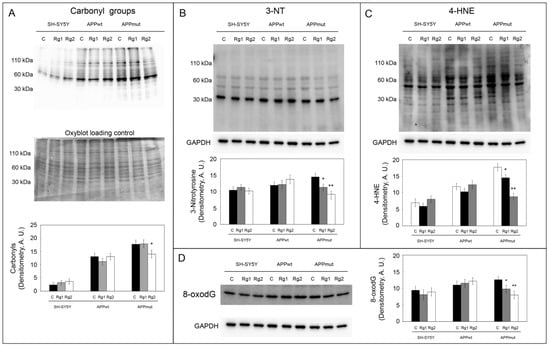 To monitor the antioxidant potential of the two ginsenosides, we detected some markers of macromolecules’ oxidation (Figure 7). Higher levels of all the considered markers were observed in APPmut cells compared to untransfected cells, confirming previous data on the altered redox state of this clone []. Carbonyl groups and 3-NT are known as important hallmarks of protein oxidation. In APPmut cells, a 1.26-fold and 1.6-fold reduction for carbonyls and 3-NT was observed upon exposure to Rg2, whereas Rg1 only diminished the levels of 3-NT (1.38-fold reduction) (Figure 7A,B). The protein bound 4-HNE was measured to highlight lipid peroxidation products. Both ginsenosides diminished the levels of 4-HNE with Rg1 being the most effective (2.0-fold reduction) (Figure 7C). DNA oxidation levels were monitored through the expression of the DNA oxidation product 8-oxodG (Figure 7D). As observed for the previously described markers, Rg1 and Rg2 decreased the amount of 8-oxodG in APPmut cells, inducing a 1.56- and a 1.28-fold reduction, respectively. No changes in the levels of the considered markers were observed in control and APPwt-transfected cells.