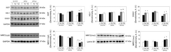 To further explore the antioxidant ability of both Rg1 and Rg2, we evaluated the expression of antioxidant enzymes. The enzyme heme oxygenase-1 (HO-1) shows strong anti-inflammatory and antioxidant properties. It mediates the conversion of heme into biliverdin, with the release of free iron and carbon monoxide. Biliverdin is then rapidly metabolized to bilirubin, a potent antioxidant []. Glutathione transferase (GST) is involved in detoxification processes and is able to provide protection against aldehydic by-products of lipid peroxidation, including 4-hydroxynonenal HNE []. We also monitored the expression of 8-oxoguanine DNA glycosylase-1 (OGG1) that detoxifies oxidized guanine base lesions produced by free radicals. APPmut cells treated with the ginsenosides showed an upregulation of these enzymes, particularly evident for the HO-1 which showed a 1.59- and 1.56-fold increase with Rg1 and Rg2, respectively (Figure 8). OGG1 resulted upregulated upon treatments also in untransfected SH-SY5Y cells. No effects were obtained on APPwt cells.