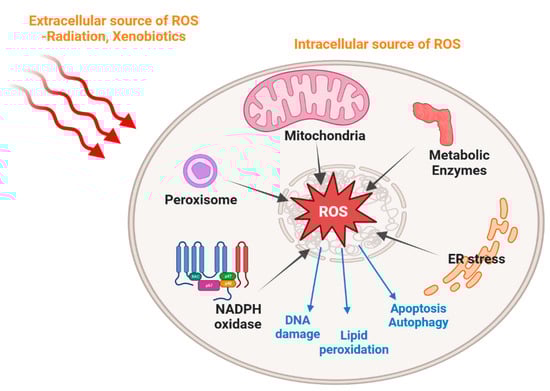 Schematic representation of oxidative stress induced by intracellular and extracellular stimuli. Extracellular sources of ROS include environmental factors such as radiation and xenobiotics. Intracellular ROS are generated mainly in the mitochondria, as well as other organelles such as the peroxisome and endoplasmic reticulum, and in addition by some metabolic enzymes. Excessive ROS production can lead to cell apoptosis, autophagy, lipid peroxidation and DNA damage.