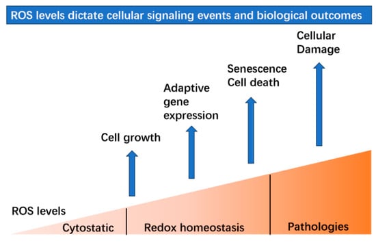 ROS levels dictate different signaling events and biological outcomes. Within the range of normal physiological levels, ROS participate in many important cellular processes to maintain redox homeostasis. At low levels, ROS promote cell growth by proliferation and differentiation. The induction of ROS levels leads to adaptive gene expression such as the up-regulated expression of antioxidative genes. Then, exposure to higher levels will result in the initiation of senescence or cell death.