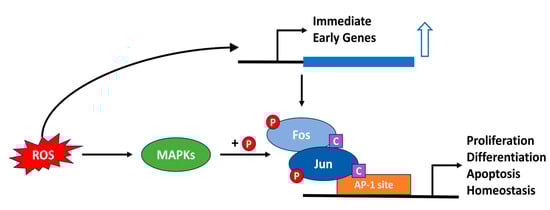 The Activator Protein-1 (AP-1) family represents a diverse subgroup of the basic leucine zipper (bZIP) transcription factors which are crucial for the regulation of cellular responses to a myriad of extracellular stimuli including ROS. bZIP transcription factors are proteins which comprise the second largest dimerizing network found in all eukaryotes []. They possess a C-terminal leucine zipper domain, which enables them to form homo and heterodimers which can bind to DNA in a sequence specific manner. DNA binding is mediated by a basic amino acid-rich domain which lies adjacent to the leucine zipper. The AP-1 transcription factors are comprised of homo- and heterodimers formed by members of the Jun (c-Jun, JunB, JunD), Fos (c-Fos, FosB, Fra-1, Fra-2), Maf (c-Maf, MafA, MafB, MafG/F/K, Nrl) and ATF (ATF2, ATF3, B-ATF, JDP1, JDP2) protein subfamilies. AP-1 proteins intricately regulate gene expression by binding to specific DNA sequences, commonly known as AP-1 sites (with a core consensus sequence of “TGACTCA”) within target gene promoters []. The composition of AP-1 dimers imparts functional diversity, with distinct family members exhibiting unique affinities for various DNA sequences and interacting partners. These proteins play indispensable roles in fundamental cellular processes, including proliferation, differentiation and apoptosis []. AP-1 factors are activated by a variety of growth factors, cytokines, neurotransmitters, hormones and environmental stressors like toxins and ultraviolet light (UV). In particular, numerous studies have revealed a highly conserved property of AP-1 from yeast to mammals that it is redox-regulated, and that the activation of AP-1 by extracellular stimuli is ROS-dependent (Figure 4) [,]. For example, exogenous ROS exposure increases both gene expression and protein levels of c-Fos and c-Jun, resulting in a stronger DNA-binding activity in epithelial cells []. Thereby, ROS scavengers or antioxidants can effectively inhibit UVB [,] or carcinogenic chemical-induced AP-1 activation [,]. The DNA-binding activity of c-Fos and c-Jun is determined by the redox state of several conserved cysteine residues []. In addition, many studies have revealed that AP-1 is also indirectly regulated by ROS signaling. The AP-1 family of transcription factors are targets for phosphorylation by the mitogen-activated protein kinase (MAPK) cascades, which are ROS responsive, and this leads to enhanced transcriptional activation [,]. The precise redox control of AP-1 activation is essential for maintaining cellular homeostasis, and the dysregulation of AP-1 function has been implicated in numerous pathological conditions, including cancer, inflammation and neurodegenerative diseases.