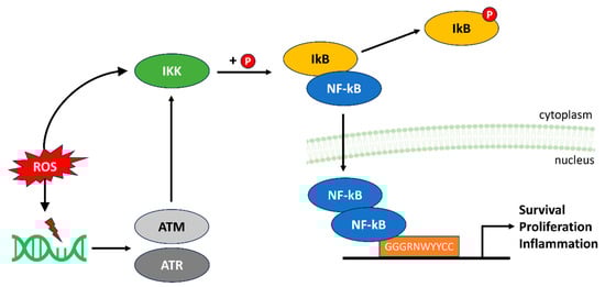 Conversely, when ROS levels surge beyond physiological thresholds, which often occurs in response to pathogens, cytokines or environmental stressors, they can have detrimental effects on NF-kB regulation []. Excessive ROS can cause sustained NF-kB activation by impairing the negative feedback mechanisms that normally keep the pathway in check. ROS can directly modify critical cysteine residues within proteins involved in the NF-kB cascade, such as IKK, leading to persistent activation []. Furthermore, ROS-induced DNA damage can stimulate NF-kB activation indirectly. The DNA damage sensors, including the ATM and ATR kinases, respond to DNA strand breaks and other lesions by phosphorylating the NF-kB essential modulator (NEMO), a subunit of the IKK complex. This phosphorylation event can promote IKK activation and, consequently, NF-kB activation, linking genotoxic stress to inflammatory responses [].