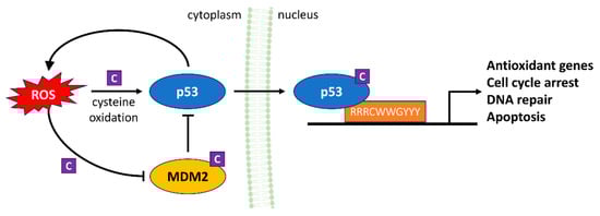 The interaction between p53 and ROS has been extensively studied []. One third of the 48 most highly H2O2-responsive genes in human cells treated with H2O2 were identified as p53 targets []. A major question is how ROS-regulated p53 results in a differential cell response (e.g., cell cycle arrest, senescence or apoptosis) by selectively regulating certain groups of target genes. It has been proposed that at basal, physiological levels, p53 performs an antioxidant role by maintaining ROS at nontoxic levels through transactivation of antioxidant genes []. However, when present at elevated levels, p53 instead can serve as a pro-oxidant by either inducing gene expression, which results in the further elevation of ROS production, or suppressing antioxidant genes. In addition, the p53 protein itself is redox-sensitive due to the presence of the cysteine residues, which can be covalently modified upon redox changes []. Therefore, ROS act as pivotal regulators in the p53 signaling pathway, both initiating and fine-tuning p53 activation in response to diverse cellular stressors.