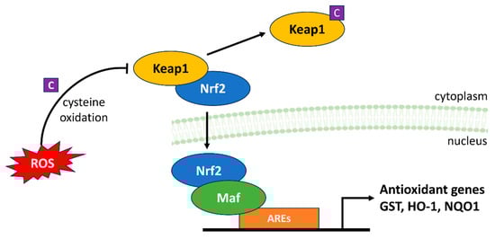 The Keap1-Nrf2-ARE signaling pathway is an extensively studied regulatory system that plays a critical role in preserving cellular redox homeostasis and shielding cells from both internal and external stresses []. In this mechanism, ROS act as a central player, providing a dynamic balance between Nrf2 activation and its inhibition by Keap1 (Figure 7) [].