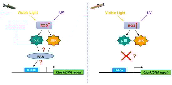 Previous work has shown striking differences in the transcriptional regulatory mechanisms which respond to light, UV and ROS between zebrafish and the Somalian cavefish (P. andruzzii). The D-box enhancer element appears to mediate light and UV-induced transcriptional responses in clock and DNA repair genes in zebrafish. Upon exposure to light and UV radiation, ROS levels increase in zebrafish cells, leading to the activation of the p38 and JNK MAPK pathways. Consequently, these MAPKs trigger the activation of PAR transcription factors, which bind to the D-box, initiating the transcription of a specific set of clock and DNA repair genes. Intriguingly, this D-box-mediated transcriptional process appears significantly attenuated in Somalian cavefish, (Figure 9) [,]. As previously described, in contrast the D-box element in mammals serves as a component of the circadian network that involves the CLOCK/BMAL1, PER/CRY and REV-ERB/RORs interlocking transcriptional feedback loops []. Similar to cavefish, no increase in D-box-driven transcription is observed in mammalian cells upon H2O2 exposure []. These differences between zebrafish, cavefish and mammals point to a degree of plasticity in transcription control of D-box element regulation during evolution in different environments. Therefore, studies of different transcriptional responses to ROS with an evolutionary perspective are of fundamental importance.