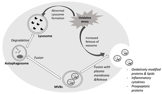 Changes in redox status prompt an elevation in the amount of exosomes, achieved through either augmented secretion or diminished degradation. In fact, enhanced autophagy conditions steer multivesicular bodies (MVBs) towards lysosomes instead of the plasma membrane, hindering the release of exosomes [125,126], while the inhibition of autophagic trafficking promotes exosome release [127]. Accordingly, enhanced secretion of exosomes has been shown under oxidative stress in different cultured cell lines [128,129,130,131]. Moreover, oxidative stress induced by nanoparticles, mechanical injury or chemicals like tBHP, has been described to increase the amount of exosomes, which is sometimes associated with morphological changes as well [131]. The impact of oxidative stress on exosomes biogenesis and release is summarized in Figure 1.