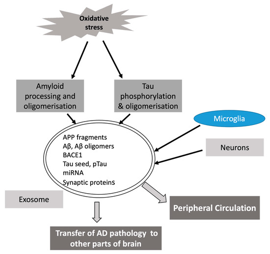 Once considered to be nothing more than cellular debris, exosomes have recently been recognized to play a significant role in the process of molecular communication both within and between cells, playing an important role in the pathogenesis of multiple diseases [13]. The involvement of exosomes in the progression of disease pathology within the central nervous system (CNS) in several neurodegenerative diseases including AD has also been well established [14,15]. On the other hand, fascinating observations have been made on exosomes in relation to oxidative stress. For instance, mesenchymal stem-cell-derived exosomes have enhanced the antioxidant capacities and alleviated cellular damage induced by oxidative stress [16]. There are other interactions of oxidative stress and exosomes which we will discuss later in this review. Importantly, this offers fresh perspectives and mechanistic connections within the complex pathogenesis of AD for the first time and also indicates the possibility of detecting simpler exosome-based AD biomarkers in the peripheral circulation. The current review is intended to delve into these aspects.