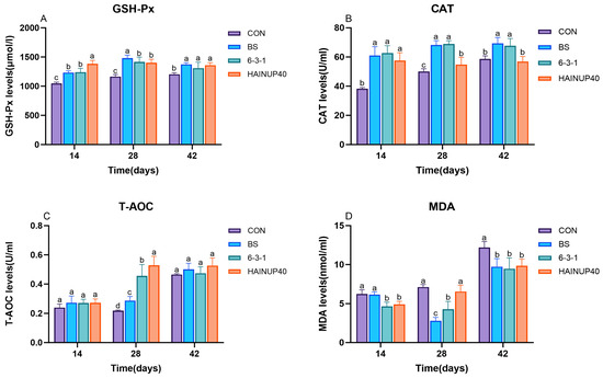 Effects of three B. subtilis strains on the serum antioxidant activities and malondialdehyde levels in the hybrid grouper. (A): glutathione peroxidase (GSH-Px); (B): catalase (CAT); (C): total antioxidant capacity (T-AOC); (D): malondialdehyde (MDA). The values are presented as the mean ± SEM (n = 9). Columns marked with different letters (a, b, c, d) indicate statistically significant differences between groups, as determined by ANOVA and Tukey’s test (p < 0.05).
