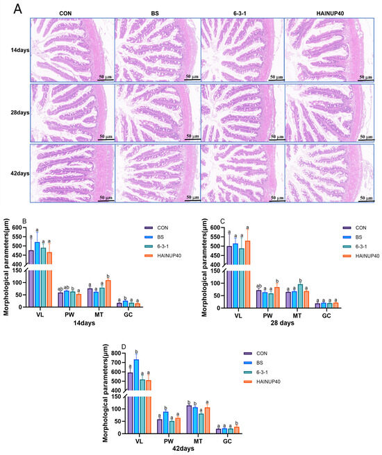 Effects of three B. subtilis strains on the intestinal morphology. (A): intestinal sections (H&E Staining) at 14, 28, and 42 days; (B): intestinal morphology at 14 days; (C): intestinal morphology at 28 days; (D): intestinal morphology at 42 days. The thickness of the analyzed sections was maintained at 4 μm, with cross-sectional diameters measured at 14 days (1426 ± 84 μm), 28 days (1607.48 ± 200.97 μm), and 42 days (1661.88 ± 53.85 μm). The scale bar is 50 μm. VL: villus length; PW: plica width; MT: muscle thickness; GC: goblet cell. The values are presented as the mean ± SEM (n = 6). Columns marked with different letters (a, b) indicate statistically significant differences between groups, as determined by ANOVA and Tukey’s test (p < 0.05).