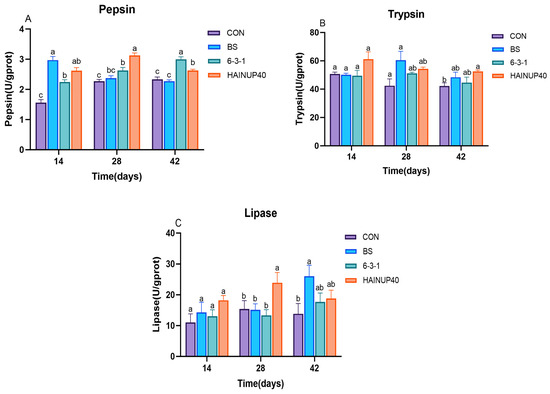 As depicted in Figure 3, the analysis of intestinal digestive enzyme activity showed changes in the hybrid group over various feeding periods. On day 14, compared to the CON group, the BS, 6-3-1, and HAINUP40 groups significantly increased levels of intestinal pepsin, with the BS group showing the most pronounced effect (p < 0.05). By day 28, compared to CON, the 6-3-1 and HAINUP40 groups significantly enhanced intestinal pepsin levels, with HAINUP40 outperforming 6-3-1 (p < 0.05). Additionally, HAINUP40 significantly elevated lipase levels (p < 0.05). On day 42, compared to CON, the 6-3-1 and HAINUP40 groups significantly increased intestinal pepsin levels, with HAINUP40 demonstrating superior efficacy (p < 0.05). Moreover, HAINUP40 significantly raised trypsin levels, while BS also enhanced lipase levels. (p < 0.05).