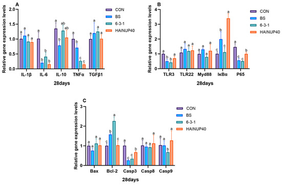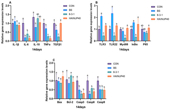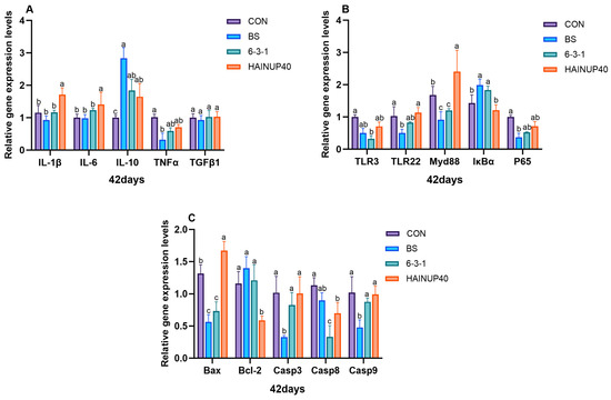 Effects of three B. subtilis strains on the expression of immunity-related genes in hybrid grouper liver (42 days). (A): genes related to inflammatory factors; (B): genes associated with inflammation pathways; (C): genes related to apoptotic proteins. The values are presented as the mean ± SEM (n = 9). Columns marked with different letters (a, b, c) indicate statistically significant differences between groups, as determined by ANOVA and Tukey’s test (p < 0.05). IL-1β: interleukin-1 beta; IL-6: interleukin-6; IL-10: interleukin-10; TNFα: tumor necrosis factor alpha; TGFβ1: transforming growth factor beta-1; TLR3: toll-like receptor 3; TLR22: toll-like receptor 22; Myd88: myeloid differentiation primary response 88; IκBα: nuclear factor of kappa light polypeptide gene enhancer in B-cells inhibitor, alpha; P65: nuclear factor kappa b subunit p65; Bax: Bcl2 associated x, apoptosis regulator; Bcl-2: B-cell lymphoma 2; Casp3: apoptosis-related cysteine peptidase; Casp8: apoptosis-related cysteine peptidase; Casp9: apoptosis-related cysteine peptidase.