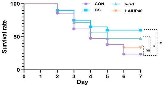 The Kaplan–Meier survival analysis of hybrid grouper-fed control and probiotic-supplemented groups after an ammonia-nitrogen stress test. Differences between the control and probiotic-supplemented groups were assessed using the Mantel–Cox log-rank test. “*” represents significant differences. “ns” indicates no significant difference. * p < 0.05.