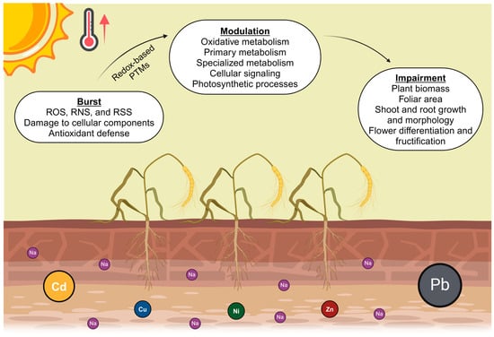 In turn, ROS, RNS, and RSS have the capacity to generate post-translational modifications (PTMs) in target proteins, altering their physiological, structural, and functional properties, which affects their stability and affinity with other proteins, biomolecules, or related metabolites. The majority of PTMs are highly specific of each protein, affecting particular amino acid residues with physical–chemical properties that render them susceptible to these types of redox-based PTMs. The modifications induce conformational changes that can either promote or inhibit enzyme catalytic activity. After reactive chemical species burst, the proteome susceptible to these redox-based PTMs acquires new modifications that can compromise structural proteins and key enzymes, but also initiate the plant acclimation processes. It has been described that reactive species initiate plant acclimation processes by modifying key amino acid residues in proteins associated with oxidative metabolism, primary and specialized metabolisms, cellular signaling, photosynthetic processes, photorespiration, and Calvin–Benson cycle [18]. The modification of structural proteins and key enzymes of cellular metabolism determines the correct functioning of essential physiological processes such as cell division, photosynthesis, chlorophyll biosynthesis, photorespiration, balance between water absorption and transpiration, stomatal opening and closing, and translocation of essential nutrients [9,18].