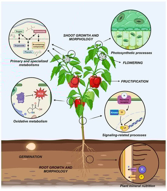 Nutrient use efficiency and assimilation, as well as carbon (C) energy metabolism, are processes of plant primary metabolism, which constitutes a large part of the physiological reactions the plant carries out to perform its vital functions. The uptake and assimilation of nutrients from the soil play a decisive role in proper plant development, as nutrients are needed to produce essential metabolites and enzymes in addition to acting as cofactors. Various types of biostimulants are reported to enhance the uptake of phosphorus (P), sulfur (S), calcium (Ca), magnesium (Mg), potassium (K), iron (Fe), and Zn, increasing their concentration and intracellular bioavailability in spinach [105,106], perennial wall rocket [98,99], rocket [103], tomato [117,122], maize [83], olive tree [93], kinnow mandarin [66], cannabis [42], and rose-scented geranium [104]. In a study carried out in tomato plants treated with an alfalfa-based PH, an increase was observed in the transcription of transporters related to ion uptake, such as sulfate transporters SULTR 2;1 and SULTR 3;1, Cu transporters, phosphate transporter PT2, Fe-phytosiderophore transporter protein yellow stripe 1 (YS1), K channels, and ABC transporters [123]. Thus, by improving fertilizer efficiency, biostimulants could reduce its application dosage. Additionally, hPDBs exhibit protective effects against the excessive accumulation of PHEs in plants grown in contaminated soils, modulating the levels of Cu [55], Cd [46], Pb, and Ni [111]. The application of biostimulants has also proven beneficial in mitigating the toxic effects of salt stress. An imbalance in the K/Na ratio causes ionic and osmotic stress in the cell, which also affects the correct assimilation of other ions. This imbalance was alleviated by biostimulants in maize [84,132], camelina [41], common bean [45,49], pea [97], lettuce [73], eggplant [54], and okra [92]. Moreover, this approach was also able to balance the levels of other essential ions such as Ca, S, P, K, Mg, and (Mn) [45,53,69,70].