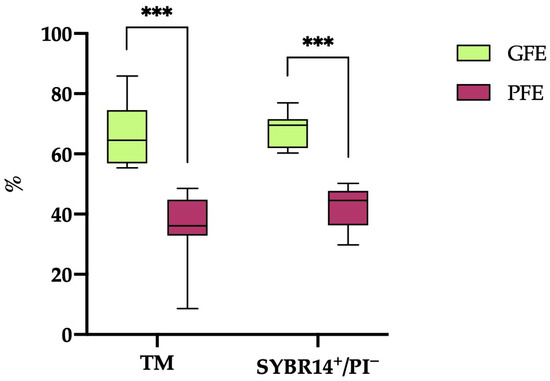 The box-and-whisker plot displays the percentages of total motile (TM) and viable (SYBR14+/PI−) sperm following thawing in horse ejaculates categorized as having good freezability (GFEs, n = 12; lime) or poor freezability (PFEs, n = 8; burgundy). The boxes represent the interquartile range (25th to 75th percentiles), the whiskers extend to the 5th and 95th percentiles and the median is denoted by a line. (***) indicates statistical significance at p ≤ 0.001.