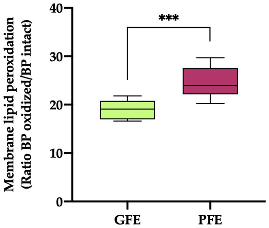 The box-and-whisker plot shows sperm membrane lipid peroxidation (ratio of BODIPY581/591-C11 (BP) oxidized/BP intact) in horse ejaculates classified as having good (GFEs, n = 12; lime) or poor freezability (PFEs, n = 8; burgundy). The boxes enclose the 25th and 75th percentiles, the whiskers extend to the 5th and 95th percentiles and the line indicates the median. (***) p ≤ 0.001.