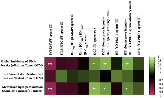 Heat map showing correlations of membrane lipid peroxidation and sperm DNA fragmentation (the incidence of global and double-strand DNA damage) with sperm functionality parameters recorded after thawing (n = 20) (plasma membrane integrity, SYBR14+/PI−; acrosome membrane integrity, PNA-FITC−/PI−; mitochondrial membrane potential, MMP, JC-1agg and ratio between JC-1 aggregates (JC-1agg) and JC-1 monomers (JC-1mon) for the sperm population with high mitochondrial membrane potential; intracellular ROS levels, DCF+/PI− and DCF+ fluorescence intensity; intracellular superoxide levels, E+/YO-PRO-1− and HE+ fluorescence intensity; and plasma membrane lipid disorder, M540+/YO-PRO-1−). The colors on the scale (1 to −1) indicate whether the correlation is positive (lime) or negative (burgundy). (*) p ≤ 0.05; (**) p ≤ 0.01; (***) p ≤ 0.001.