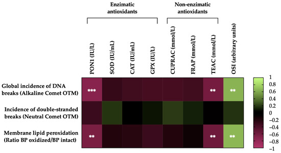 Heat map showing correlations of membrane lipid peroxidation and sperm DNA fragmentation (the incidence of global and double-strand DNA damage) after thawing (n = 20), with the activity levels of enzymatic (paraoxonase type 1, PON1; superoxide dismutase, SOD; catalase, CAT; and glutathione peroxidase, GPX) and non-enzymatic antioxidants (measured in terms of cupric-reducing antioxidant capacity, CUPRAC; ferric-reducing ability of plasma, FRAP; and Trolox-equivalent antioxidant capacity, TEAC) and the oxidative stress index (OSI) of seminal plasma (SP) in horse ejaculates. The colors on the scale (1 to −1) indicate whether the correlation is positive (lime) or negative (burgundy). (**) p ≤ 0.01; (***) p ≤ 0.001.
