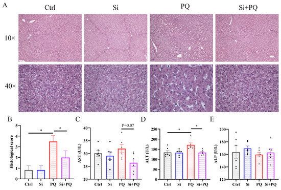 Dietary silybin supplementation alleviated liver injury induced by paraquat in piglets. (A) Representative H&E staining of liver tissues (captured at 100× or 400× magnification). (B) Histopathology scores of liver tissues. (C–E) Plasma activities of AST, ALT, and ALP. Ctrl, piglets were given a basal diet and were challenged with saline; Si, piglets were given a silybin-supplemented diet and were challenged with saline; PQ, piglets were given a basal diet and were challenged with paraquat; Si + PQ, piglets were given a silybin-supplemented diet and were challenged with paraquat; AST, aspartate transaminase; ALT, alanine transaminase; ALP, alkaline phosphatase. Data are expressed as mean ± standard error (n = 6). * p < 0.05.