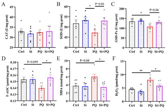 As shown in Figure 2, compared with the control group, the piglets challenged with PQ had significantly decreased GSH-Px activity (p < 0.05) and increased H2O2 levels (p < 0.05), and tended to have a lower T-AOC level (p = 0.10) and higher MDA content (p = 0.08) (Figure 2C–E). In contrast, dietary silybin significantly increased the T-AOC level and decreased the concentration of MDA and H2O2 (p < 0.05), and tended to increase the activities of SOD (p = 0.06) as well as GSH-Px (p = 0.06) (Figure 2B–E). Moreover, there was no significant difference in CAT activity among all groups (p > 0.05) (Figure 2A).