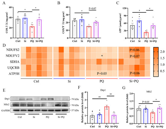 As shown in Figure 5, PQ challenge decreased the activities of mitochondrial complexes I and V and subsequently reduced the ATP content in the liver (p < 0.05) (Figure 5A–C). However, dietary silybin supplementation alleviated the PQ-induced decrease in mitochondrial complex I and V activity compared to the PQ group, thereby enhancing the production of ATP (p < 0.05). Consistently, we found that PQ treatment downregulated the expression level of NADH ubiquinone oxidoreductase core subunit V2 (NDUFV2) (p < 0.05) and tended to decrease ATP synthase subunit d (ATP5H) (p = 0.05) compared to the control group (Figure 5D), while silybin supplementation elevated the abovementioned gene expression in the liver of the PQ-challenged piglets (p = 0.07 and p = 0.06, respectively). In addition, dietary silybin also upregulated the mRNA expression of NADH ubiquinone oxidoreductase core subunit S2 (NDUFS2) in response to PQ challenge (p = 0.06) (Figure 5D). Moreover, PQ challenge increased the protein abundance of dynamin 1 (Drp1) and decreased the protein abundance of mitofusin 2 (Mfn2), while silybin supplementation significantly reversed the abovementioned trend (p < 0.05) (Figure 5E–G).