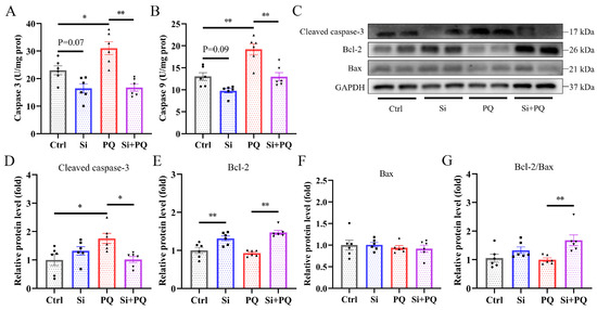 Dietary silybin addition suppressed hepatocyte apoptosis. (A,B) The activities of caspase 3 and caspase 9 in the liver tissues. (C) Representative image of Western blot. The protein expression levels of Cleaved caspase 3 (D), Bcl-2 (E), Bax (F), and the ratio of Bcl-2 to Bax (G). Ctrl, piglets were given a basal diet and were challenged with saline; Si, piglets were given a silybin-supplemented diet and were challenged with saline; PQ, piglets were given a basal diet and were challenged with paraquat; Si + PQ, piglets were given a silybin-supplemented diet and were challenged with paraquat; Bcl-2, B-cell lymphoma-2; Bax, Bcl-2-associated-X-protein; Bcl-2/Bax, the ratio of Bcl-2 to Bax. Data are expressed as mean ± standard error (n = 6). * p < 0.05, ** p < 0.01.