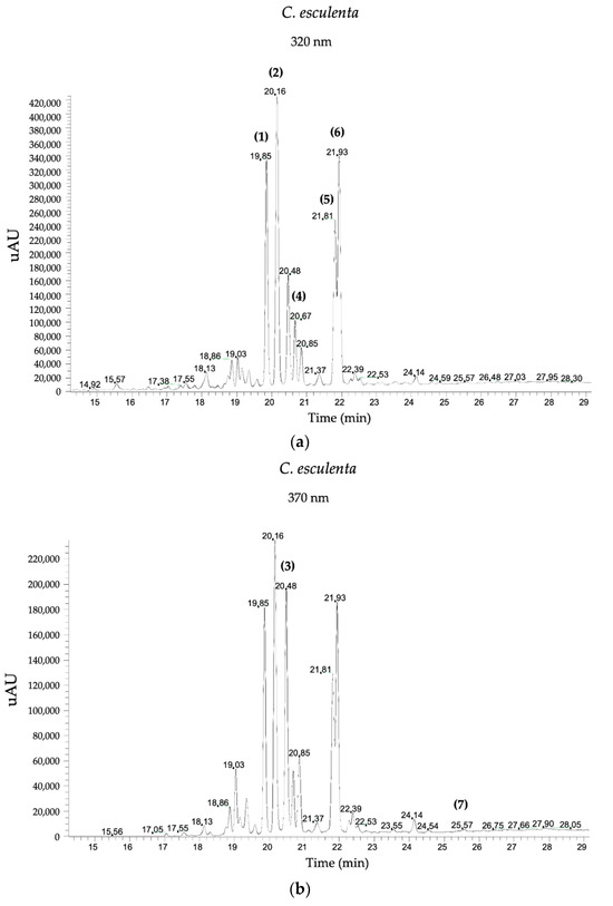 - Goncalves, R.F.; Silva, A.M.S.; Silva, A.M.; Valentao, P.; Ferreres, F.; Gil-Izquierdo, A.; Silva, J.B.; Santos, D.; Andrade, P.B. Influence of Taro (Colocasia esculenta L. Shott) Growth Conditions on the Phenolic Composition and Biological Properties. Food Chem. 2013, 141, 3480–3485. [Google Scholar] [CrossRef]